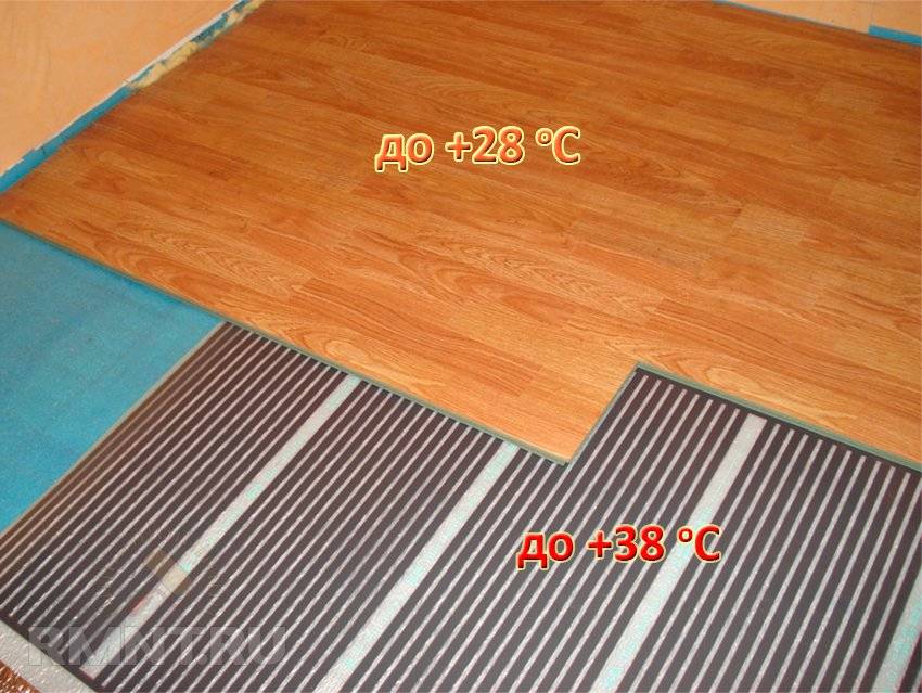 Укладывать ламинат или линолеум можно непосредственно на ИК-плёночный нагреватель. На максимальных режимах работы он не нагревается свыше 35 °С — напольное покрытие от них не расплавится и не рассохнется. Однако выбранное напольное покрытие должно иметь соответствующий допуск, что помечается на упаковке специальным значком или пояснением, что данный ламинат/линолеум совместим с электрическим или водяным тёплым полом.