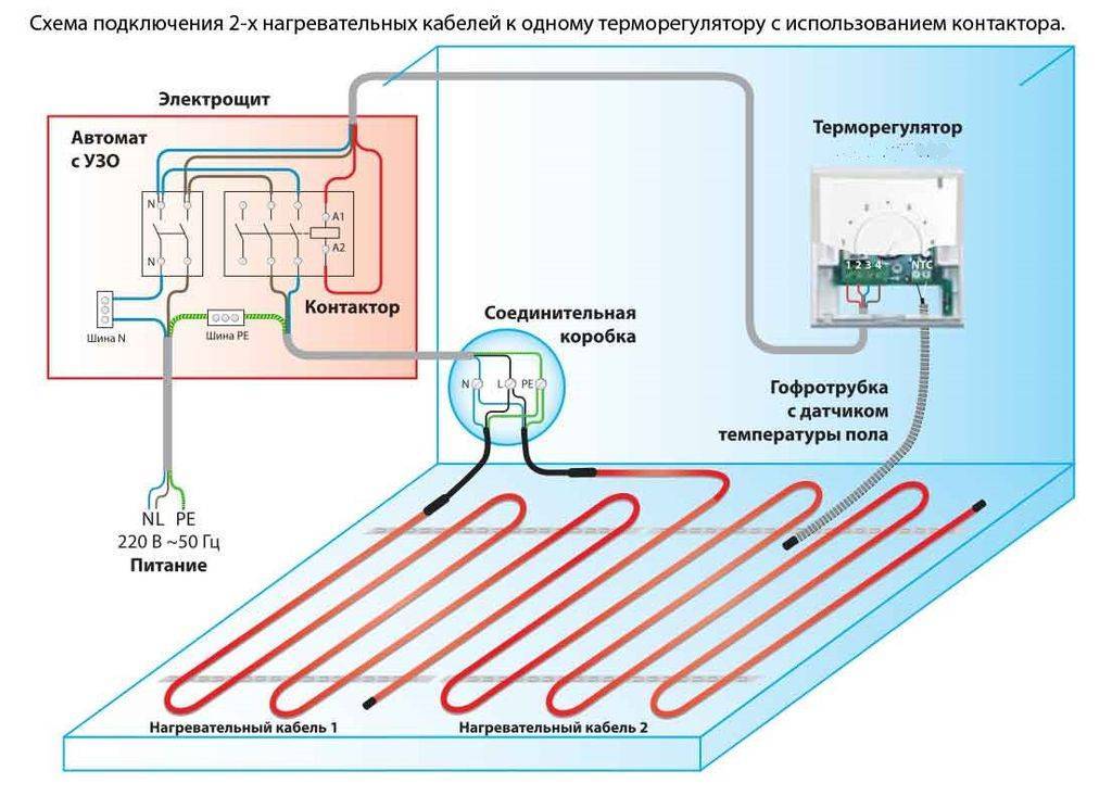 - Для подключения теплого пола прокладывается отдельная силовая линия, которая подключается через диффавтомат или связку УЗО плюс автоматический выключатель.