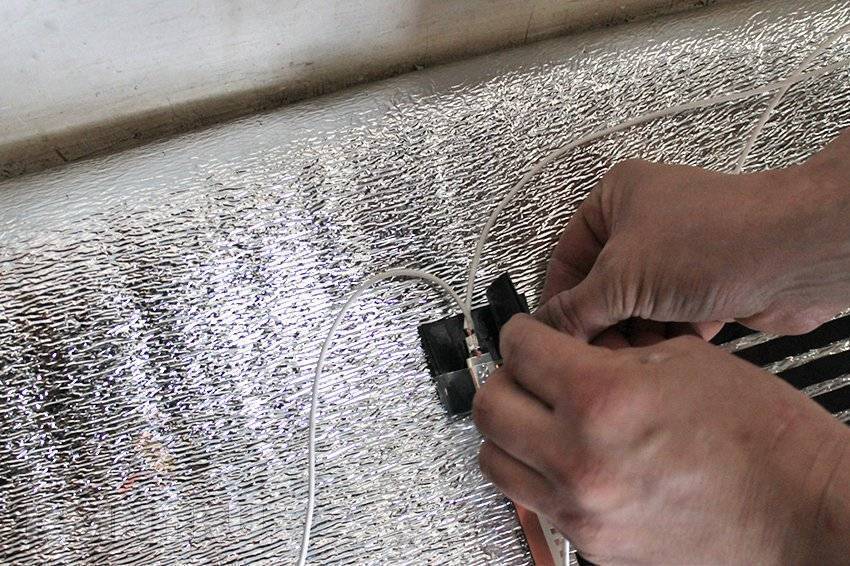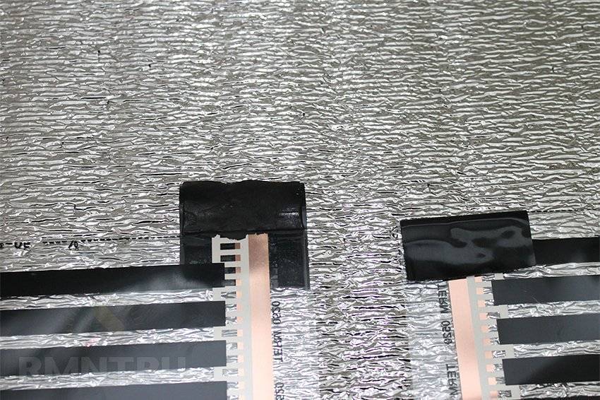 Каждое место подключения изолируется двумя кусочками битумной изоленты (один кладется под контакт, а другой сверху). Надежная изоляция — залог безотказной работы теплого пола.