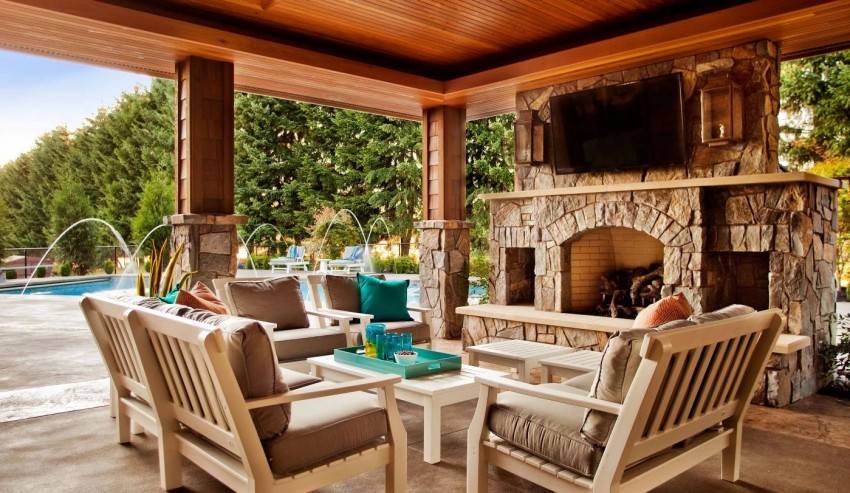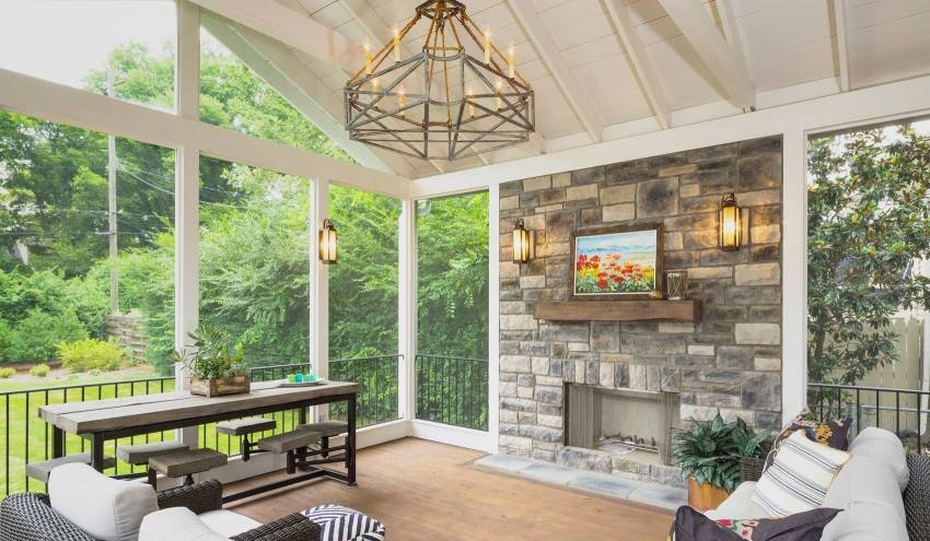 Дизайн веранды открывает широкие возможности для реализации различных идей, например, Вы можете установить на ней камин