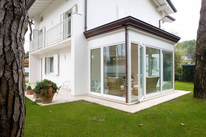 Веранда представляет собой полноценную пристройку с фундаментом, стенами, окнами и крышей, которая может быть встроенной в дом сразу при возведении или же быть пристроенной как со стороны главного входа, так и с обратной стороны дома с выходом в сад или двор.