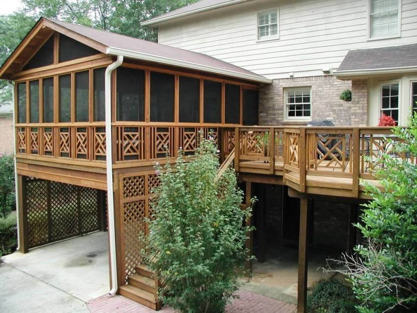 Чаще всего террасы делают деревянными. Однако они тоже могут классифицироваться на разные виды, в зависимости от количества уровней, размеров, формы, типа ограждения, декора и т. д.