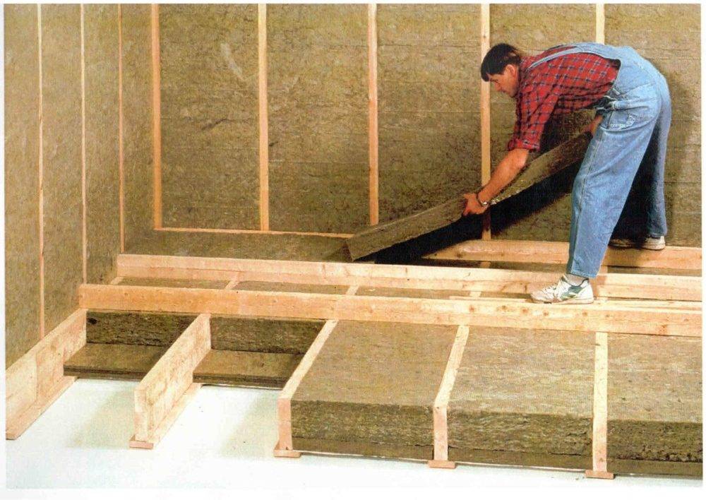 Утепляют полы так же послойно. Для минваты обязательно жесткое основание, так как материал низкой плотности не может держать собственный вес, не прогибаясь.