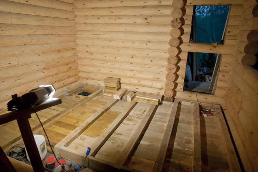 Рассмотрим один из наиболее сложных вариантов – устройство черновых полов по лагам без балок перекрытия. Такой пол часто встречается в небольших комнатах частного дома или в случаях особенностей технологии строительства сруба, когда балки перекрытия не использовались.