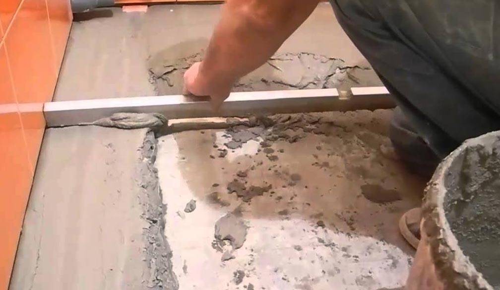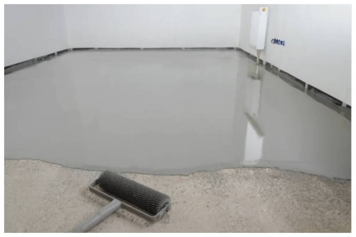 Перед подготовкой раствора самовыравнивающей жидкости основание пола покрывается гидроизоляцией или грунтовкой. При условии, что половую плитку надо наклеить на пол из бетона, его основание выравнивается цементно-песочным раствором.