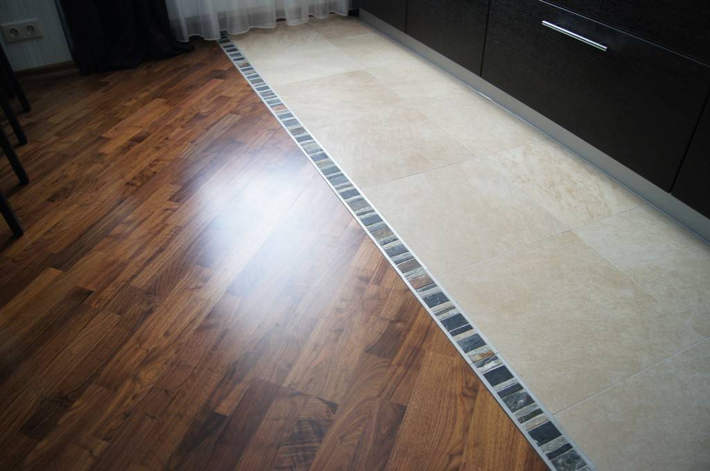 Например, ламинат, уложенный по диагонали, неплохо совмещается при переходе порогов с керамической плиткой.