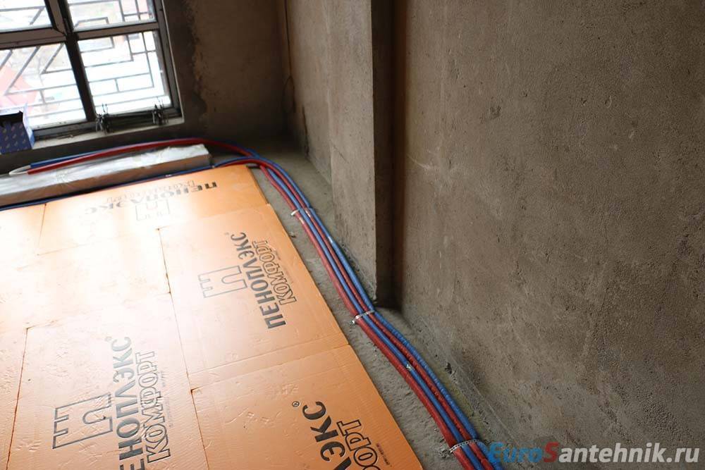 Далее под тёплый водяной пол своими руками укладывается теплоизоляционный материал. Рынок предлагает огромное многообразие вариантов, каждый из который имеет свои «за и против». Наиболее популярным считается пенополистирол экструдированный толщиной около 10 см.