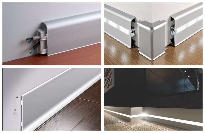 Легкий блестящий металл эффектно смотрится в современном интерьере. Плинтусы, изготовленные из анодированного алюминия или хромированной латуни, обладают механической прочностью, износостойкостью, не требовательны в уходе и очень долговечны. Используются преимущественно в местах с высокой проходимостью.