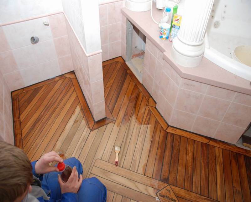 Для напольного покрытия подойдет отборная древесина, например, тик. Как известно, именно он применяется при строительстве кораблей, которые плавают за многие тысячи километров. Деревянные суда безразлично относятся к воздействию влаги за счет особых эфирных масел, содержащихся в волокнах дерева. Их высокая концентрация позволяет со спокойной душой использовать кораблестроительный материал в ванной комнате. Для этого необходимо лишь заделать специальным герметиком зазоры между досками. Существенный недостаток такого покрытия – его стоимость.