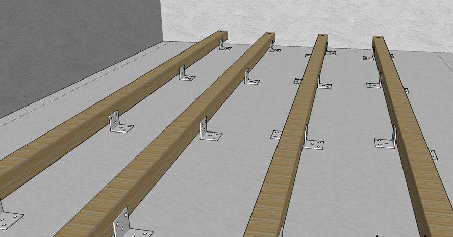 К полу рейки прикручивают шурупами с помощью металлических угловых пластин, одна сторона которых прилегает к дереву, вторая — к основанию пола. Крайние крепежи располагают в 2-3 см от торцов реек, все последующие – с шагом 50 см.