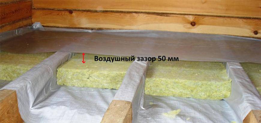 По высоте лаги должны превышать утеплитель на 50 мм для обеспечения естественной вентиляции.