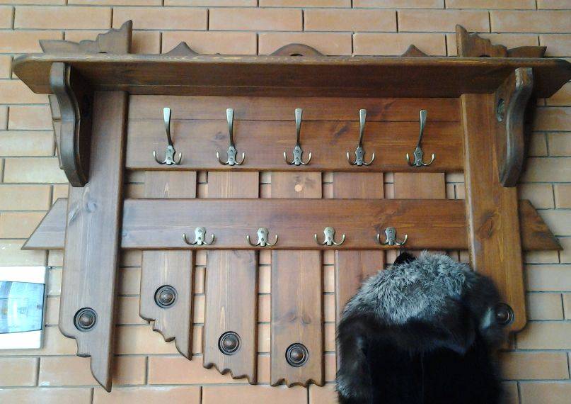 Самым простым и распространенным типом конструкции принято считать деревянную доску с расположенными на ней крючками, крепящуюся к стене помещения. Возможно наличие полочек, предназначенных для головных уборов.