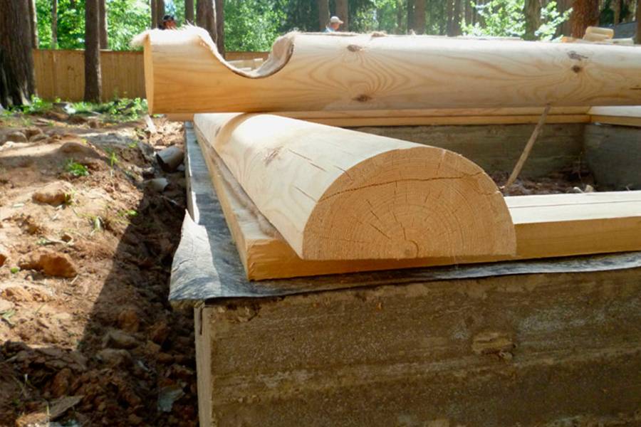 На подготовленном фундаменте ставят оклад. Это первый венец сруба