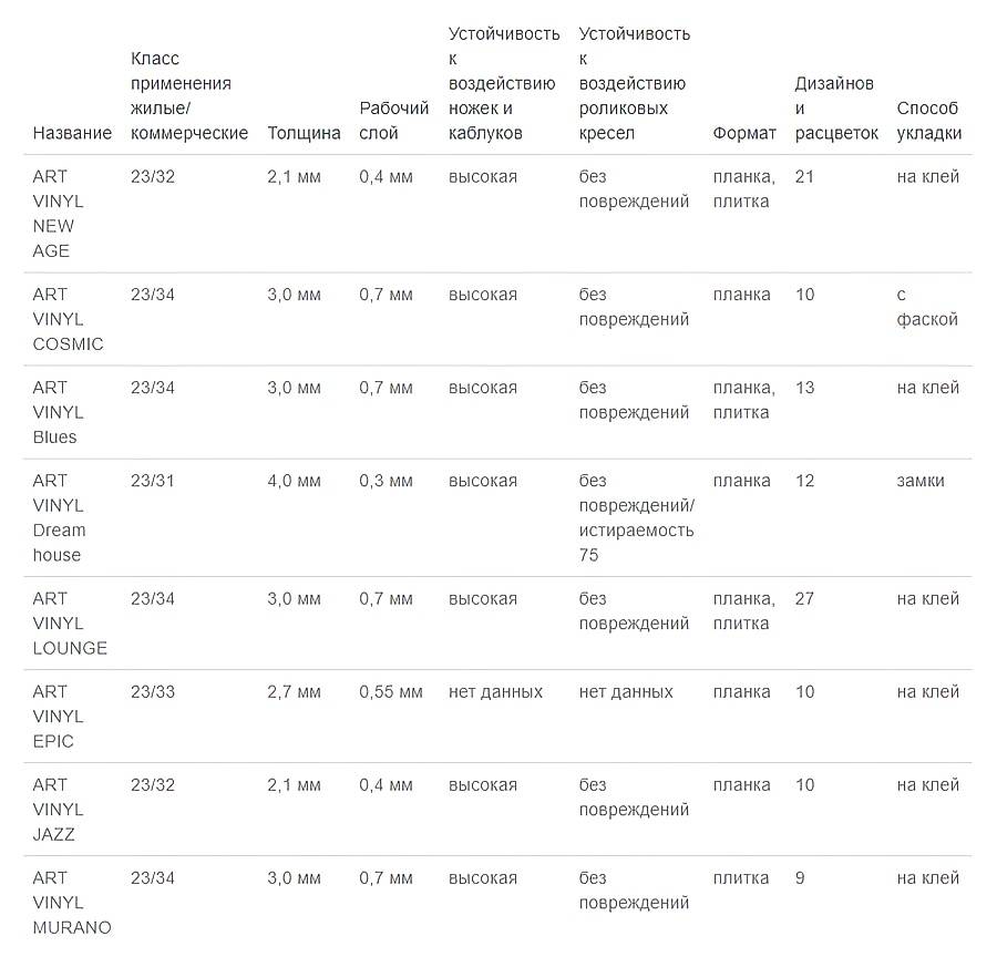 Покрытие для пола Арт Винил Таркетт имеет высокую стойкость к истиранию, если говорить об использовании в домах и квартирах, все коллекции имеют класс использования 23, что в данной области — максимум.