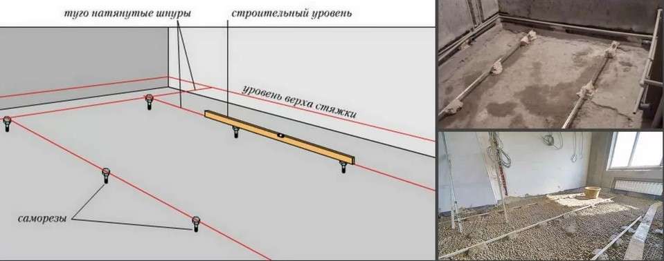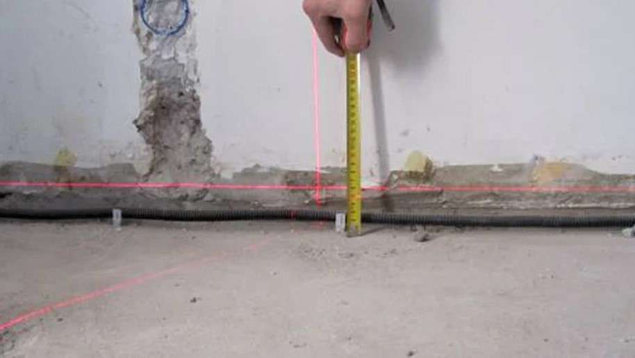 Желательно, чтобы стяжка была в одной плоскости во всех комнатах. Горизонт размечается с помощью водяного или лазерного уровня. Первый шаг — определить самую верхнюю точку основания, от которой впоследствии нужно будет отмерить высоту стяжки: