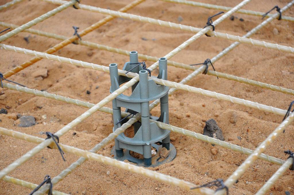 - Монтаж арматуры поверх утеплителя. Нижняя половина бетонного слоя должна содержать армирующую сетку, которая немного приподнимается над утеплителем пластиковыми подпорками.