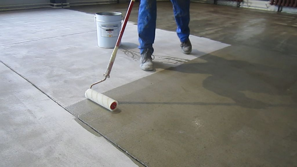 Перед началом работ по заливке полов поверхность следует прогрунтовать. Для бетонной стяжки используется грунтовка по бетону, а для цементно-песчаной – обычная. Основание грунтуется при помощи валика, а в труднодоступных местах используется кисточка. На очень сухую пористую поверхность грунт наносится дважды.