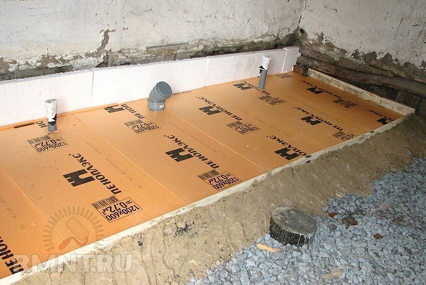Для выполнения гидроизоляционного слоя применяют рулонные материалы, например, полиэтиленовую пленку. Чтобы гидроизоляция получилась более надежной, настелить полиэтилен лучше в несколько слоев. Его полотна надо расстилать внахлест, края должны заходить друг за друга на 15-20 см. Края пленки заворачивают на стены на высоту, на которой предполагается сделать заливку, и закрепляют там.