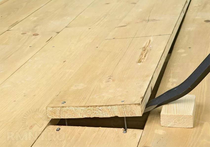 Перед тем как доски старого пола будут сниматься, важно удалить плинтуса, расположенные вдоль стен. Они будут тормозить рабочий процесс и сильно мешать, если этот этап подготовки пропустить