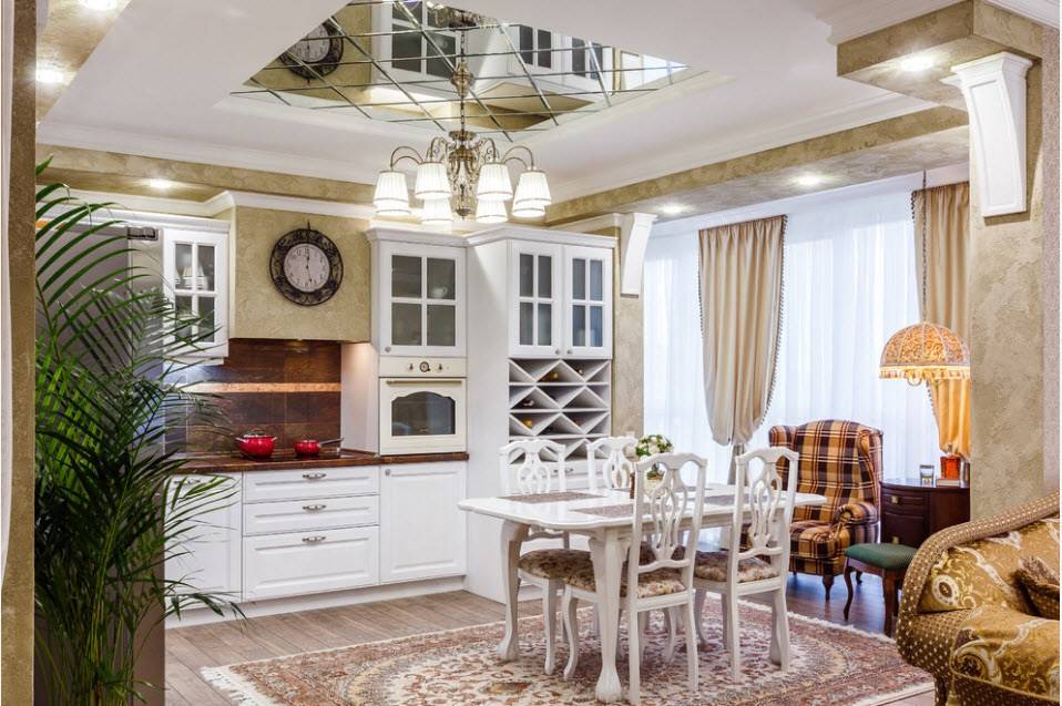 Ещё один вариант – организовать мозаичный кант по периметру потолка. Особенно придётся по вкусу такое эффектное оформление любителям классики. Кроме того, естественный свет, идущий от окон, максимально заполнит пространство комнаты.