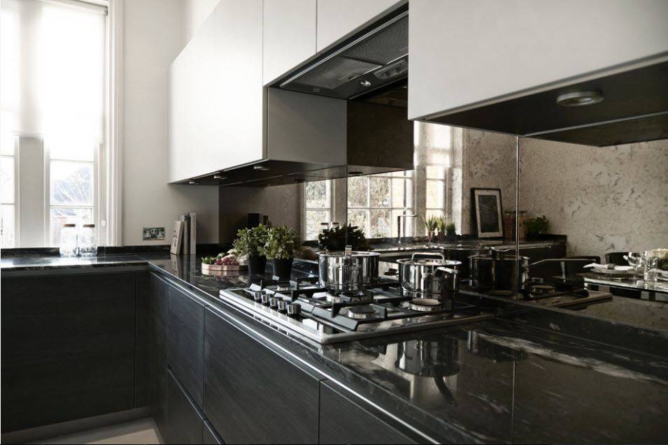 Выбор места для зеркал может быть оригинальным и самым неожиданным. Зеркальный цоколь в основании шкафчиков – нетривиальное решение для обычной кухни.