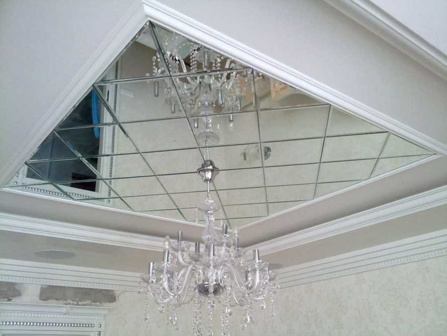 Интересная идея для декорации потолка: оформить зеркальной мозаикой не весь потолок, а только зону крепления люстры