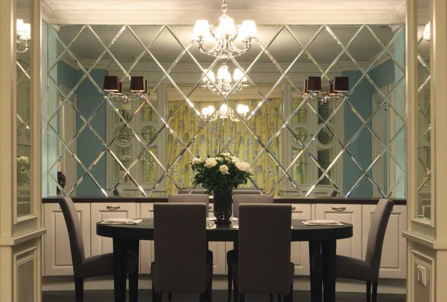 Зеркал в интерьере не должно быть слишком много. Рекомендуется отделывать зеркальной плиткой одну из поверхностей (полностью или частично) или смежные поверхности (угол на стыке двух стен, стены и потолка). Для отделки смежных поверхностей желательно использовать разную плитку — прозрачную и тонированную или однотонную и с рисунком.
