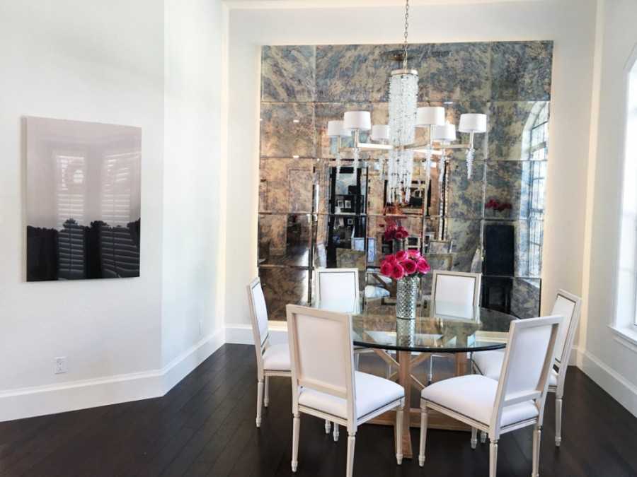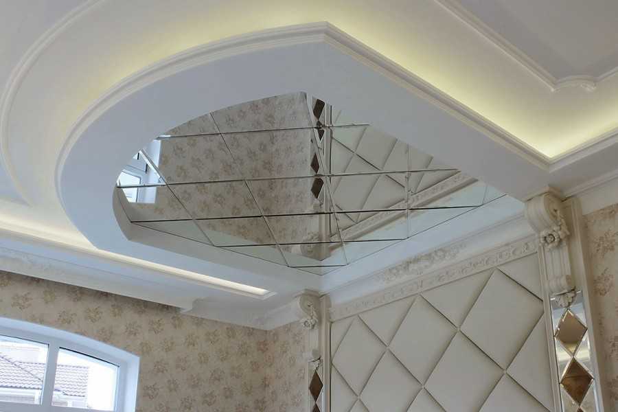 Зеркальные островки на потолке помогут выделить функциональную зону в комнате. В гостиной такие части можно расположить над обеденным столом.